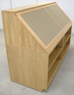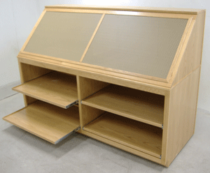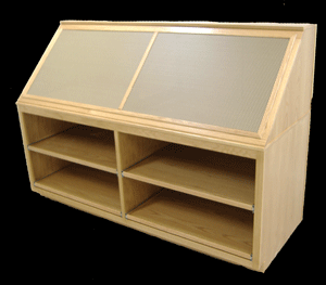 Fixture that displays electronic fish finders (sonar) and GPS units. Shelves in base portion rollout for easy access to merchandise and restocking.
