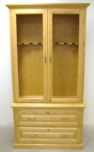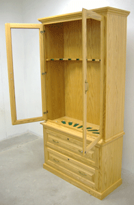 Made of solid oak and oak veneers with a rich, golden oak stain and lacquer finish, this cabinet looks great in a home or cabin. Upper portion displays 9 guns in a unique horseshoe shape behind tempered glass doors that open a full 180 ° for easy access to firearms. Holds most scoped rifles in most positions in the cabinet. Thick green felt in butt and barrel rests protect guns from scratches. Drawers glide easily on ball bearing slides with 200# load ratings. All doors and drawers are lockable, but are not meant to provide protection against theft. This cabinet could be built with doors replacing the drawers in the bottom unit.