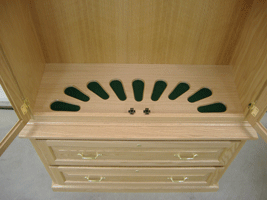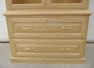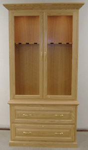 Made of solid oak and oak veneers with a clear lacquer finish, this cabinet looks great in a home or cabin. Upper portion has accent lights and displays 9 guns in a unique horseshoe shape behind tempered glass doors that open a full 180 ° for easy access to firearms. Holds most scoped rifles in most positions in the cabinet. Thick green felt in butt and barrel rests protect guns from scratches. Drawers glide easily on ball bearing slides with 200# load ratings. All doors and drawers are lockable, but are not meant to provide protection against theft.