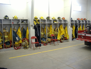 These locker units were built for our local Volunteer Fire Dept. when they outgrew their old lockers. They are constructed of grey melamine and have storage with coat hooks for the coats and pants, a shelf for gloves and other items and a place to store helmets above. The melamine is virtually maintenance free and easy to clean.